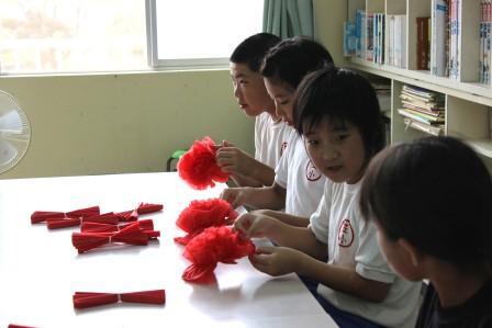 10人のかさっこが いっしょうけんめい 作った お花で 運動会を 飾ります。
