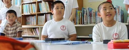 2年生と 3・4年生が 合同で朝の会を行っています。