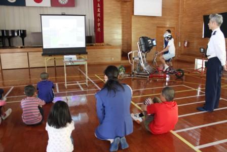 たくさんの機械を持ってきていただいて、警察や交通安全協会の方の説明のもとに、自転車運転のシミュレーションに挑戦したかさっこです。