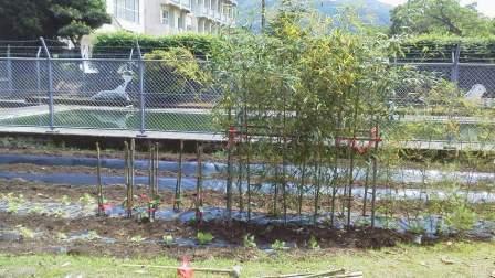 今日は、地域の方が、かさっこ農園のキュウリとナスの苗に、竹を立てに来て下さいました。