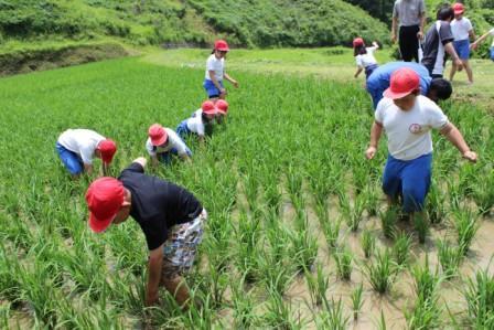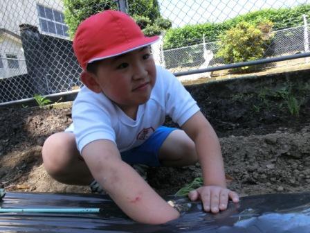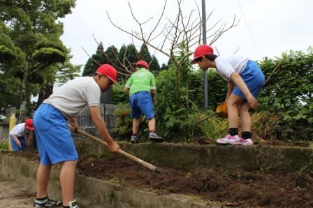 芋の苗を地域の方からいただき、また、保護者の方に耕すのを手伝ってもらうなど、たくさんの方に協力していただいて、芋の苗を植えることができました。