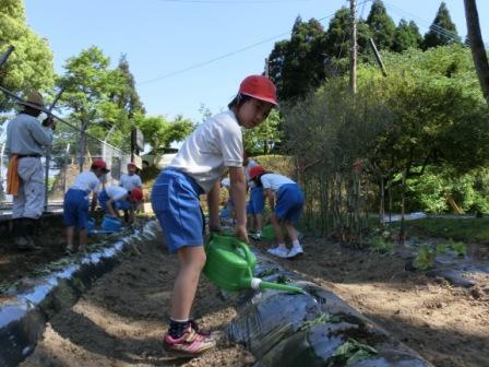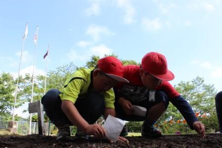 2年生が、トマトに、カブに・・・と野菜の種や苗を植えました。