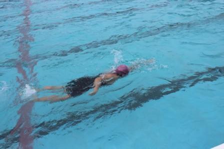 まずは、プールサイドに座って、足をバタバタ、バタバタ・・・