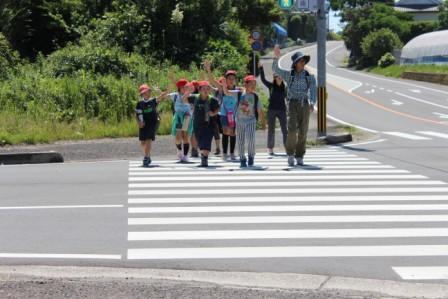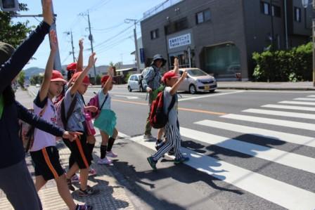 そして、先日交通安全教室で学習したことを、実践しました。しっかり手を挙げて、「右よし。左よし。」