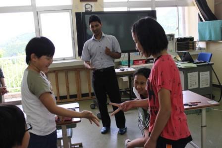 5年生と6年生の内容を織り交ぜながらの学習です。ジャンケンももちろん英語です。会話の練習はゲームをしながら、覚えるのが難しい言葉はジェスチャーを付けての練習です。