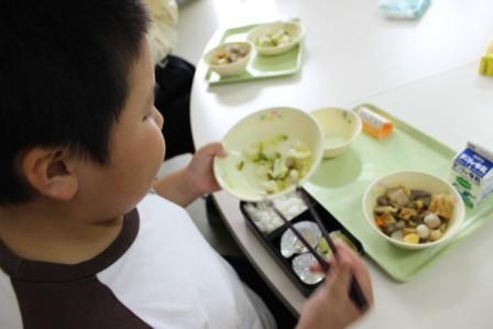 そして、お弁当箱給食を行いました。自分のお弁当箱の大きさは、必要な量の料理が入るでしょうか。ちょうどいい大きさのお弁当箱の目安にもなりますね。