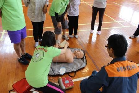 今年は、開会式の後に心肺蘇生法とAED講習を行いました。学校に設置してあるAEDを地区のより多くの方々が使えるようになるために、講習会を計画しました。