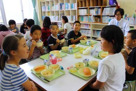 4・5・6年生と、1・2・3年生とに分かれて食べました。