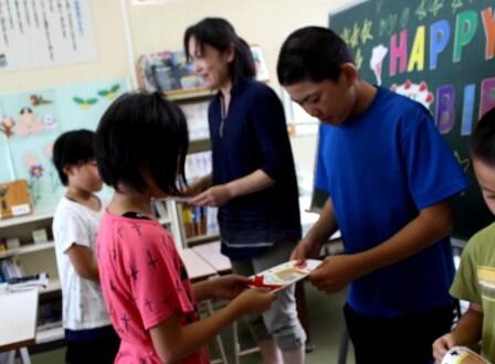 全員からの お祝いカードをもらって、うれしそうですね。