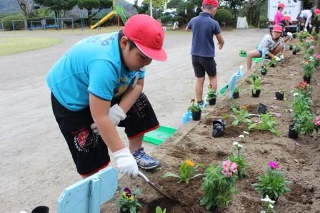 一人一花壇に花の苗を植えました。