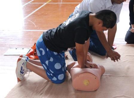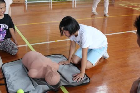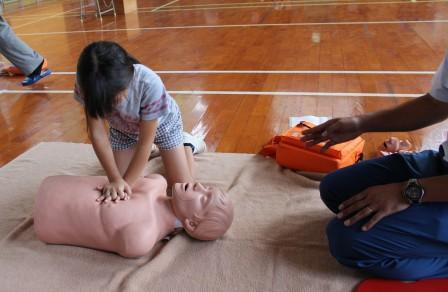 その後、できるのなら胸部を圧迫して、救急車を待ちます。
