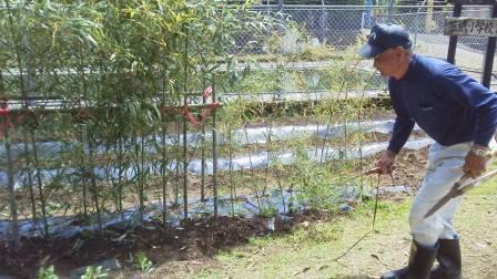 今日は、地域の方が、かさっこ農園のキュウリとナスの苗に、竹を立てに来て下さいました。