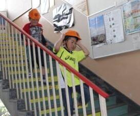 次に、実際に避難しました。廊下や、階段で転ばないように、落ち着いて・・・