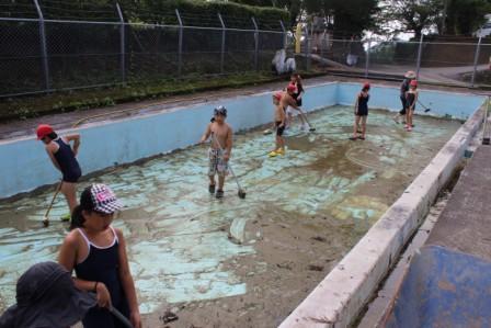 いつもは、防火用水となっているプールを一生懸命お掃除しました。