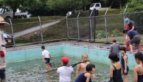 そして、子ども達とお母さん方はプールの掃除です。一時的にプールに移した鯉を池に返してあげるために捕まえるのが一苦労でした。きれいになったプールにきれいになった水源地から山水が流れてきてさわやかな気持ちになりました。