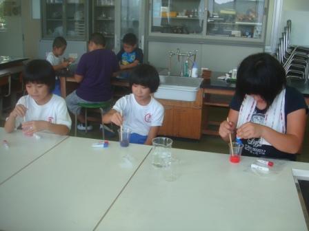 洗濯糊の入った液体に好きな色の絵の具を混ぜます。