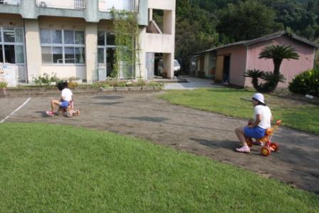 5・6年生も三輪車にチャレンジ! とっても苦労していました。