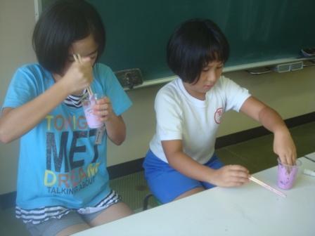 洗濯糊の入った液体に好きな色の絵の具を混ぜます。