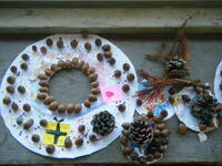 先日、1年生は学校の周りを探検しながら、きれいな色の落ち葉や木の実を拾ってきました。