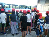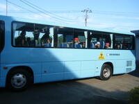 市内小学校の5年生140名(欠席がいたので、参加できた児童は138名)が市文化会館に集まり、出発式をしたあと、バスで青島青少年自然の家に向かいました。