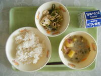 今日の給食の献立は「麦ごはん・牛乳・根菜の味噌汁・とりすき」でした。根菜の味噌汁には、さつまいもが入っていました。