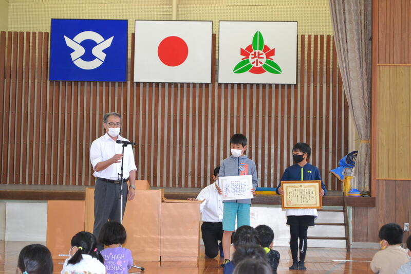 また、子ども造形作品展と少年野球の表彰も行いました。学校外でもいろいろな面で児童が活躍してくれています。とてもうれしいことです!