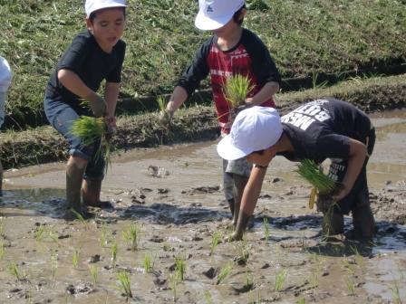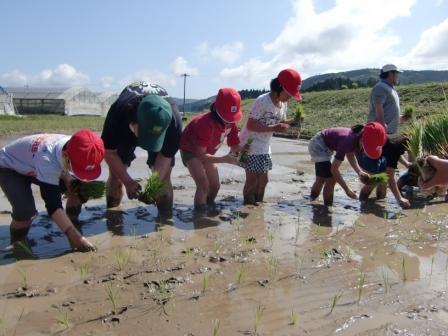 今年もJA青年部の協力をいただいて、田植えを行いました。学校の東側にある実習田で全校1年から6年までの児童が手植えを体験しました。JAの方々に植え方を教えていただいた後、さっそく田圃に入って田植えをしました。初めての1年生は田圃に足を取られて大変でしたが、がんばって植えました。上学年は慣れた手つきで、下学年の分も最後まで植えました。早場米なので、8月3日に稲刈りを予定しています。これから5年生が観察していきます。