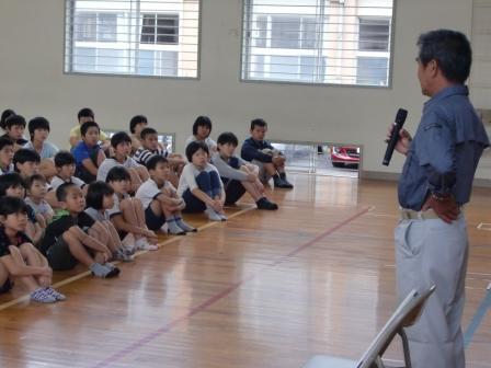 7月15日(金)着衣泳の学習を行いました。上学年と下学年に分かれて、串間市消防署の協力を得て、授業を実施しました。普段の服を着たままで、自分の身を守るための泳法を消防署の方に教わり、仰向けに浮いていく練習をしました。教えられたとおりにすると、力を抜いて浮く姿が見られました。自分の命は自分で守る、このことも大事な学習です。
