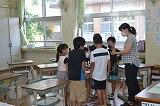 とても楽しそうにいろいろな大きさのシャボン玉ができていました。空中をゆらゆらと漂うシャボン玉を追いかけて捕まえようと一生懸命な児童もいました。木もれ日に照らされて虹色に輝きながら漂うシャボン玉はとても幻想的でした。1年生にとって楽しい夏の思い出となったことでしょう。