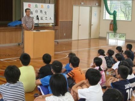 6月27日(火)に全校で愛鳥集会を開きました。北方小学校は、県の愛鳥モデル校になっています。愛鳥集会では、日本野鳥の会の井手保宏さんを招いて、鳥の話などをしていただきました。毎年アオバズクが飛来してせんだんの木にとまっています。今年は残念ながらアオバズクは来ていませんが、井手さんからなぜアオバズクが飛来しなかったのかについても話していただきました。鳥の生態など学習するよい機会となりました。