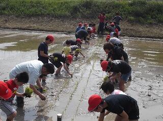 子どもたちは、お互い助け合いながらどろんこになって、稲を一つ一つ丁寧に植えていました。6年生は、初めて体験する1年生に優しく植え方を教えていました。とてもほほえましい光景でした。