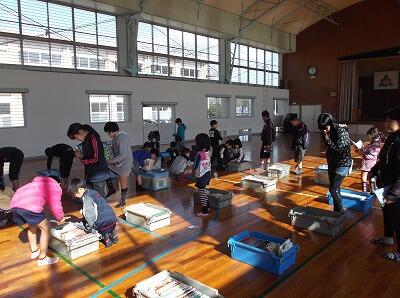 昼休みになると、体育館に開設させた月一回の移動図書館に、子ども達が