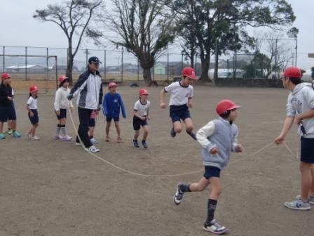 後半の長縄では、縦割りの班で跳ぶ回数を競いました。6年生がうまく回してあげると、1年生も上手に跳ぶことができていました。
