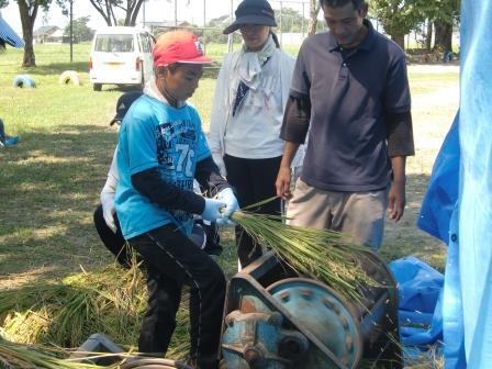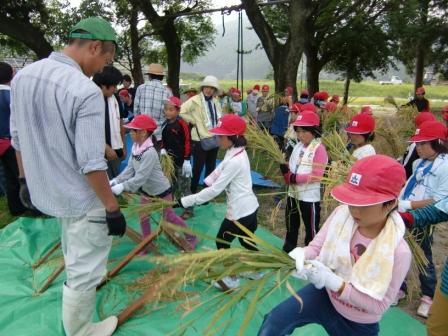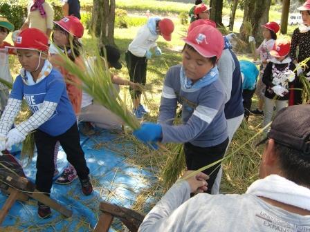 夏休み中の登校日に北方小学校の田の稲刈りと脱穀がありました。4月に植えた苗が立派に実って稲刈りの頃となりました。たくさん実った稲穂を5・6年生が中心に刈り取りました。刈り取った稲は全校で脱穀作業をしました。昔の道具である、足踏み脱穀機や千歯こぎを使って脱穀しました。1年生も慣れてきて楽しく上手に作業できました。