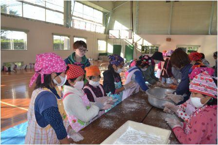 年間を通して、田植え、草取りなど稲の世話、稲刈り、脱穀と進めてきました稲作活動の締めくくり、もちつき交流会を行いました。総勢55人ほどの加勢をいただいて、保護者や地域の高齢者の方々と一緒に、もちをついたり丸めたりしました。