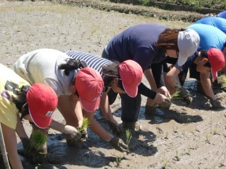 今年もJA青年部の協力をいただいて、田植えを行いました。学校の東側にある実習田で全校1年から6年までの児童が手植えを体験しました。JAの方々に植え方を教えていただいた後、さっそく田圃に入って田植えをしました。初めての1年生は田圃に足を取られて大変でしたが、がんばって植えました。上学年は慣れた手つきで、下学年の分も最後まで植えました。早場米なので、8月3日に稲刈りを予定しています。これから5年生が観察していきます。