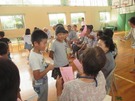 生活科の学習の一環として、1・2年生と地域の高齢者との交流「せんだん祭り」を行いました。今年も、29名という多数の高齢者の方々が来てくださいました。昔の遊び(お手玉、あやとり、こま、おはじき、ビー玉、竹馬)を教えていただきながら高齢者との交流を深めました。最後に、子どもたちがおじいちゃんやおばあちゃんの顔を描いてプレゼントしました。ご協力、本当にありがとうございました。