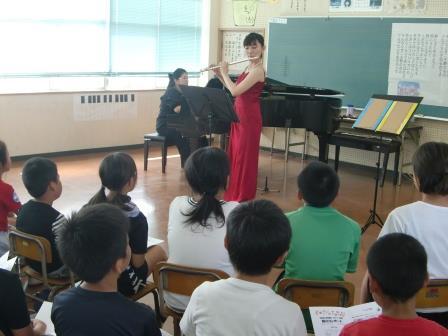 10月12日(木)に鑑賞教室を開きました。今年は、県芸術劇場から一流の演奏者の方を迎えて、「北方小秋のコンサート」として開催しました。ピアノやフルートの生の演奏に子どもたちは聴き入っていました。チケットやパンフレットをもらうなどコンサートの雰囲気も味わいました。