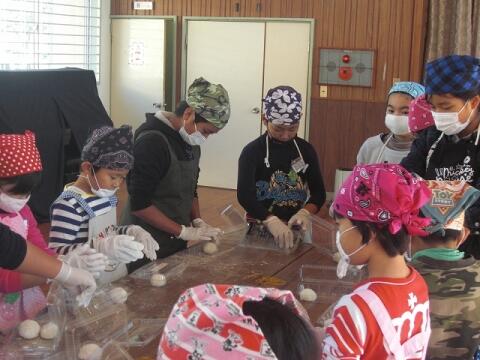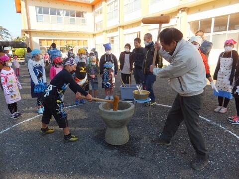 年間を通して、田植え、草取りなど稲の世話、稲刈り、脱穀と進めてきました稲作活動の締めくくり、もちつき交流会を行いました。総勢55人ほどの加勢をいただいて、保護者や地域の高齢者の方々と一緒に、もちをついたり丸めたりしました。