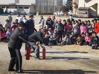 集合後、まず、串間市消防署の2名の方から、火災の発生件数、原因、火災の怖さなどを詳しく話していただきました。次に、消火器の使う場面や使い方を教えていただいた後、5・6年と教職員代表が実技を行いました。