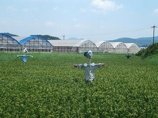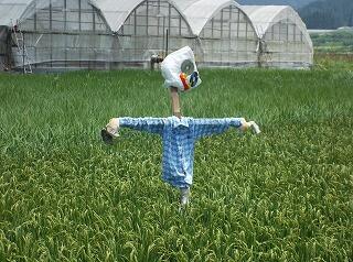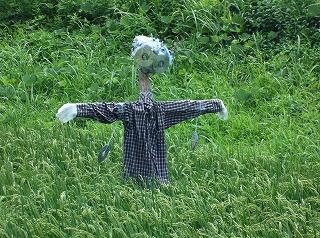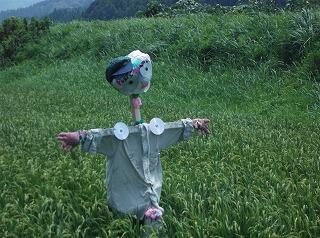 5年生が早速、かかしを作ってくれました。愉快な表情になっていますが、かかし3人衆は、子どもたちの気持ちを胸に、がんばってくれることでしょう。