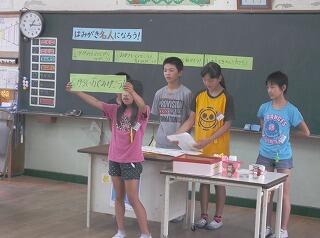 6月の生活目標は「歯を大切にしよう」です。健康委員会の児童がこの目標を推進したいと考え、養護教諭の指導のもと、昼休みに歯磨きの仕方を説明しています。
