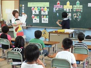 1年生に偏食をしないで多くの食材を食べてほしいとの目的で学習が展開されました。