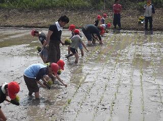 子どもたちは、お互い助け合いながらどろんこになって、稲を一つ一つ丁寧に植えていました。6年生は、初めて体験する1年生に優しく植え方を教えていました。とてもほほえましい光景でした。