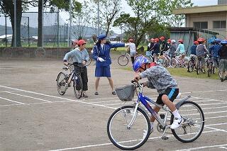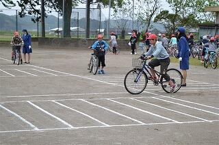 はじめに、串間市警察署の方から交通安全の大切さについてのお話がありました。そして、交通指導員の方に正しい横断の仕方や自転車の点検の仕方、自転車の正しい乗り方について詳しく説明していただきました。その後、実際に1年~3年は、徒歩での道路横断を、4年~6年は、自転車点検や自転車による道路横断を練習しました。