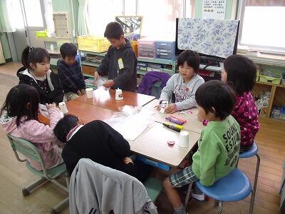 まず、1年生が勉強のことや学校で楽しいことなどを、紹介しました。次に、ゴムを使ったおもちゃ、ビー玉を使ったおもちゃ、ストローを土台にした飛行機を、1年生が教えてあげながらに作り上げ、仲良く一緒に遊びました。入学予定の子どもたは、もとても楽しそうでした。小学校入学への期待が大きくふくらみました。