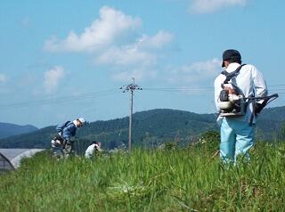 心配された天気も曇り空で、暑くもなく作業には最適な天気になりました。作業内容を「窓ふき担当」「旧草捨て場の埋め立て担当」「通学路等の草刈り担当「遊具補修の担当」の4つに分け、進めました。