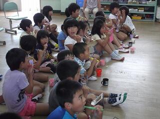 6/18(火)から低学年の部、中学年の部、高学年の部の3回に分けて、歯磨きの大切なポイントを模型などを使って、分かりやすく説明しています。説明の後は、みんなで歯磨き練習を行います。