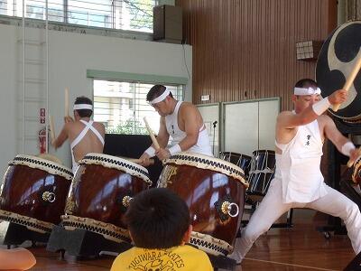 橘太鼓「響座」の方々においでいただき、プロの演奏や姿勢、動きを子ども達に披露していただきました。子ども達は、巧みな演奏に感動していました。
