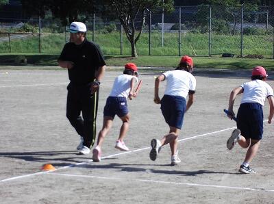 岩田先生と細野先生から指導のあった「渡すときに声を出すこと」「ハイと言われてから手を後ろに出すこと」「前走者と自分の走力に合わせてリードすること」などを、念頭において子ども達はがんばってバトンパスの練習をしていました。